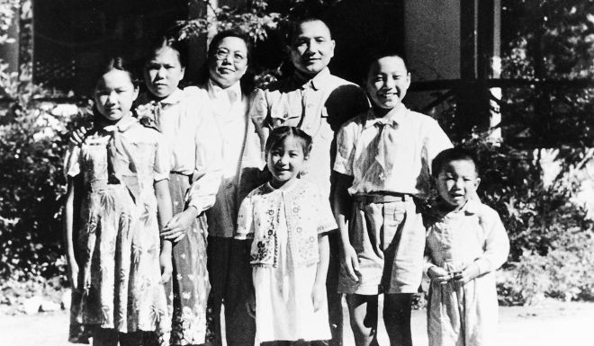Ông Đặng Phác Phương lúc nhỏ (thứ hai từ phải qua) đứng cạnh ông Đặng Tiểu Bình, cùng mẹ và các em trong thập niên 1950 – Ảnh: SCMP