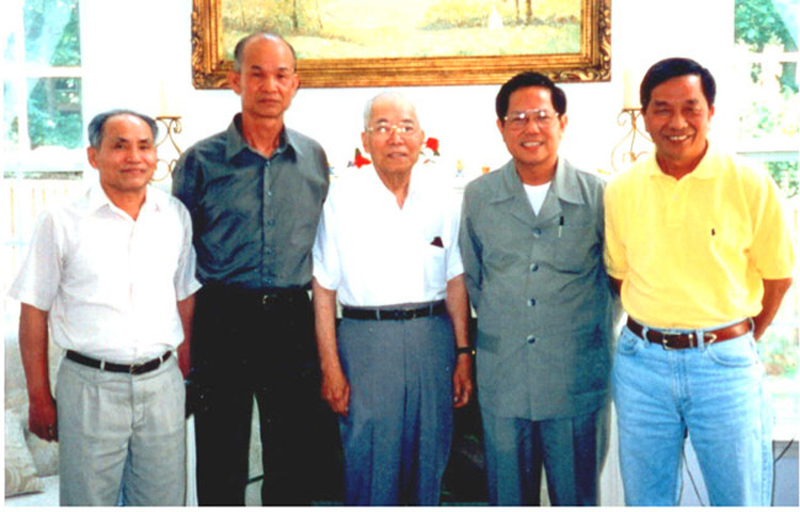 Lãnh Tụ Hà Thúc Ký (đứng giữa), Thi văn sĩ Quốc Nam (đứng cạnh cụ Ký bên phải hình) & 3 Cán Bộ thuộc Ban Chấp Hành Trung Ương Đại Việt Cách Mạnh Đảng, gặp nhau năm 2002, tại tiểu bang Maryland – Hoa Kỳ.